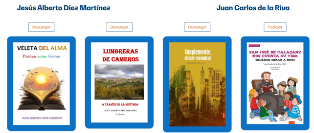 - Escritores noveles: “Os presentamos aquí la obra literaria de algunos escolapios noveles que, sin gran experiencia en el arte de escribir y publicar, han encontrado eco en quienes han leído su obra, y merece ser divulgada y compartida. Comenzamos con algunos de ellos, Jesús Alberto Díez y Juan Carlos de la Riva, con el deseo de que en esta sección podamos ir incorporando muchos más”.